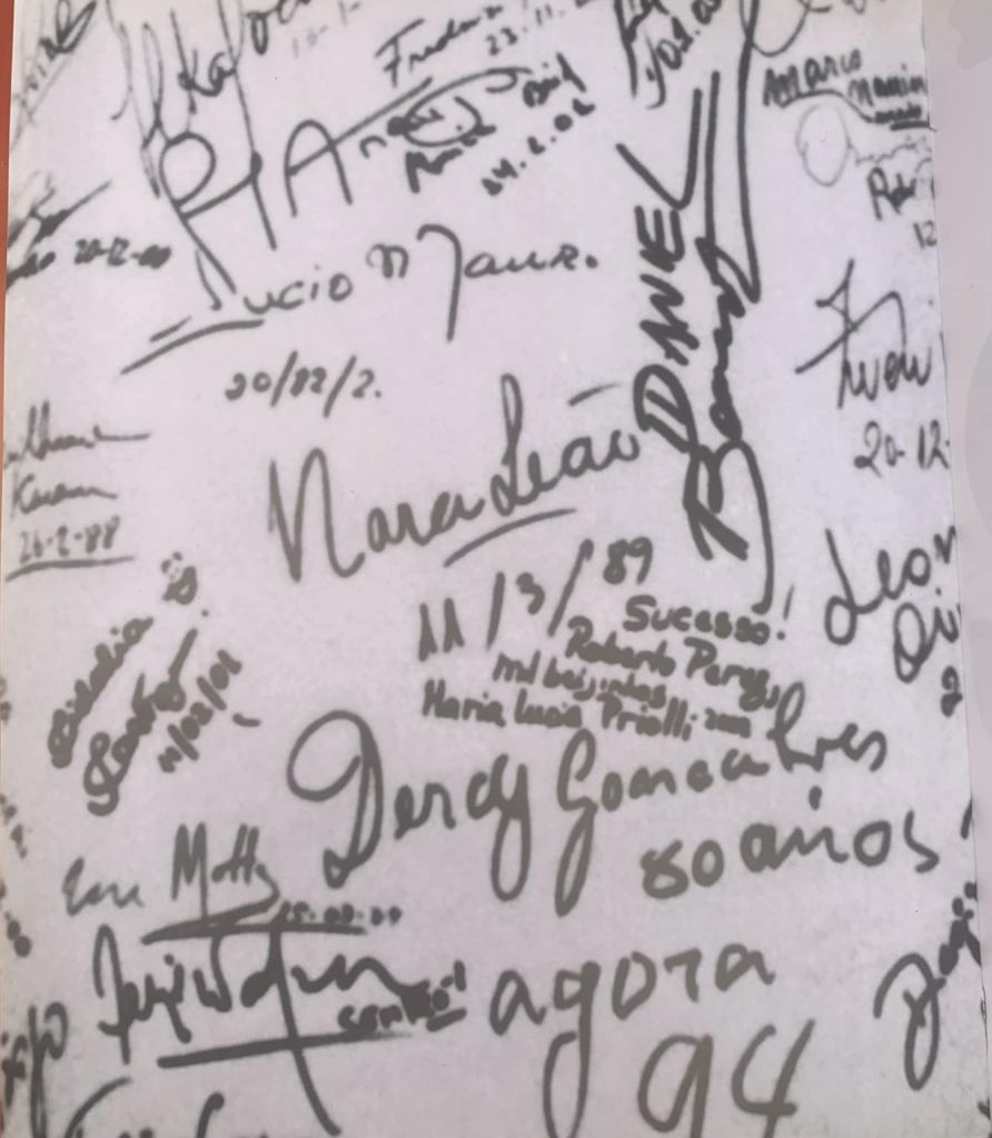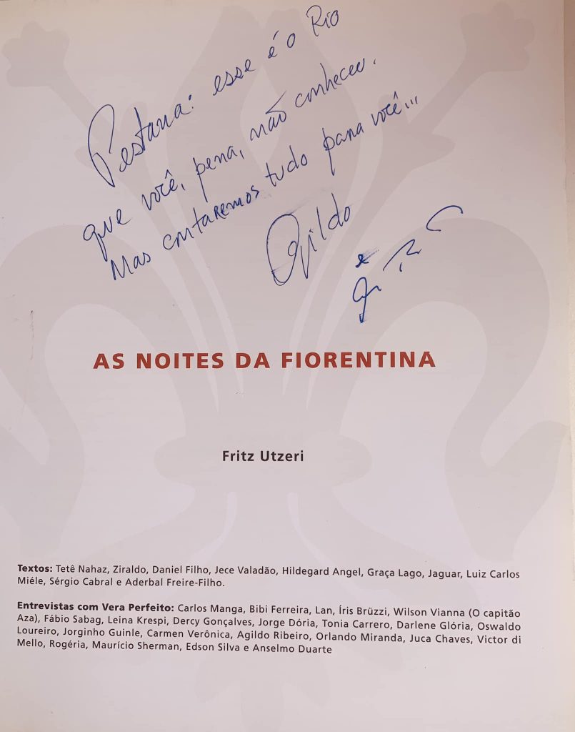 O livro “As Noites da Fiorentina” de Fritz Utzeri, edição Panorama Editora, com dedicatórias do Agildo e Catito, oferecido numa noite longa no Leme, “sem hora certa para fechar” (bordão do estabelecimento), assinaram “Pestana esse é o Rio que você, pena, não conheceu. Mas contaremos tudo pra você”. Entrar na La Fiorentina em Lisboa, é viver a história dos anos dourados de Copacabana, um mergulho na história do RIO, dos artistas que, quando atravessavam o Atlântico e vice-versa, eram capa de revista com manchetes, idolatrados (excetuando alguns portugueses de penetra), não faltam registos de Carmen Miranda, Amália Rodrigues, Raul Solnado e outros que pisaram os palcos cariocas. Os Madredeus, também não estão ali, julgo que passaram pela Fiorentina do Leme, numa noite da semana “Lisboa no Rio” (23 a 28 maio 1991) para cear, aquando atuaram pela primeira vez no Brasil, em concertos na Sala Cecília Meireles, com lotações esgotadas, dividindo o palco com o saudoso Carlos Paredes. Outra sala cheia e anexos que me recordo, de uma fabulosa mostra de Lisboa, foi a palestra (lição) na Fundação Roberto Marinho do arquiteto Álvaro Siza Vieira, relacionada com a recuperação do Chiado. Um valioso programa da CML-Turismo de Lisboa, ondei deixei pegada…
